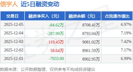 证券之星消息,12月5日,信宇人(688573)融资买入221.94万元,融资偿还306.57万元,融资净卖出84.62万元,融资余额8708.41万元。