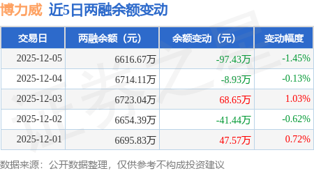 证券之星消息,12月5日,博力威(688345)融资买入401.58万元,融资偿还499.02万元,融资净卖出97.43万元,融资余额6616.67万元。