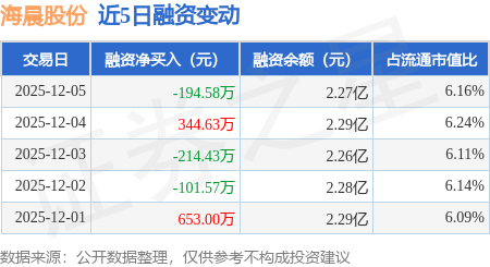 证券之星消息,12月5日,海晨股份(300873)融资买入392.53万元,融资偿还587.12万元,融资净卖出194.58万元,融资余额2.27亿元。
