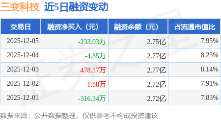 证券之星消息,12月5日,三变科技(002112)融资买入1305.85万元,融资偿还1538.89万元,融资净卖出233.03万元,融资余额2.75亿元。