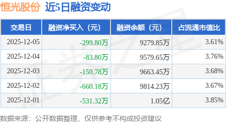 证券之星消息,12月5日,恒光股份(301118)融资买入386.91万元,融资偿还686.72万元,融资净卖出299.8万元,融资余额9279.85万元。