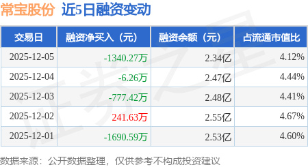 证券之星消息,12月5日,常宝股份(002478)融资买入2363.79万元,融资偿还3704.05万元,融资净卖出1340.27万元,融资余额2.34亿元。
