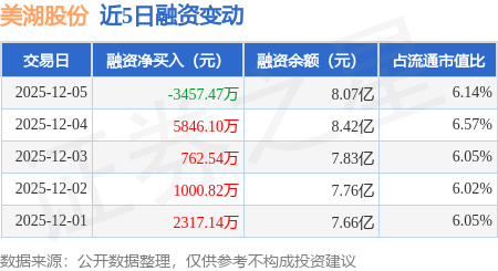 证券之星消息,12月5日,美湖股份(603319)融资买入8524.95万元,融资偿还1.2亿元,融资净卖出3457.47万元,融资余额8.07亿元。