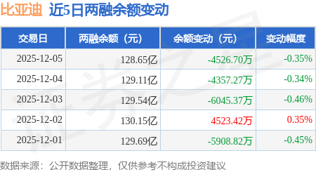 证券之星消息,12月5日,比亚迪(002594)融资买入1.57亿元,融资偿还2.06亿元,融资净卖出4886.27万元,融资余额128.13亿元。