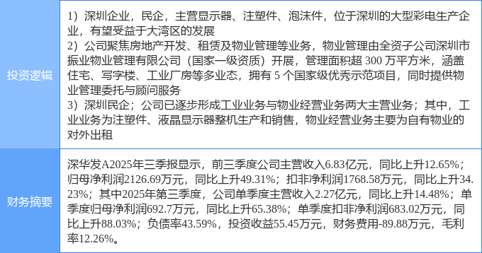 该股为深圳本地股,粤港澳大湾区,物业管理概念热股,当日深圳本地股概念上涨1.19%,粤港澳大湾区概念上涨0.7%,物业管理概念上涨0.08%。
