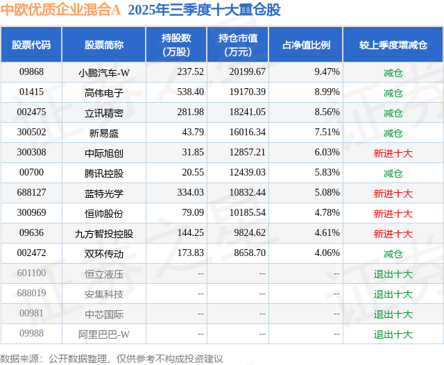 根据2025基金Q3季报公募基金重仓股数据,重仓该股的公募基金共13家,其中持有数量最多的公募基金为中欧基金的中欧优质企业混合A。中欧优质企业混合A目前规模为20.06亿元,最新净值1.2914(12月5日),较上一交易日上涨1.17%,近一年上涨43.5%。该公募基金现任基金经理为代云锋。代云锋在任的基金产品包括:中欧洞见一年持有混合,管理时间为2022年7月7日至今,期间收益率为21.61%;中欧科技成长混合A,管理时间为2024年2月2日至今,期间收益率为95.48%。