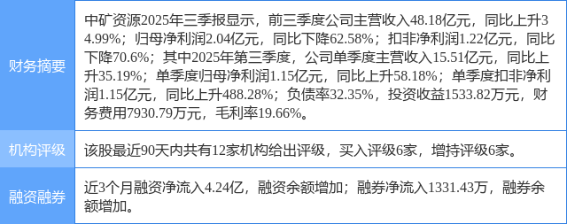 2025年10月30日,民生证券研究员邱祖学,南雪源发布了对中矿资源的研报《2025年三季报点评:Q3扭亏为盈,铜锗项目投产在即》,该研报对中矿资源给出“买入”评级。研报中预计公司2025-2027年归母净利4.6、12.2和36.3亿元,对应10月29日收盘价的PE为85、32和11倍,维持“推荐”评级。证券之星数据中心根据近三年发布的研报数据计算,该研报作者对此股的盈利预测准确度为57.36%。
