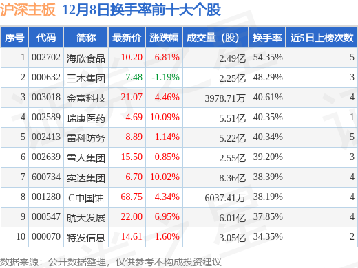 当日沪深主板换手率前10大个股中9只个股收涨,平均涨幅5.14%,其中海欣食品(002702)以换手率54.35%排第一,9只个股近5个交易日中多次上榜。