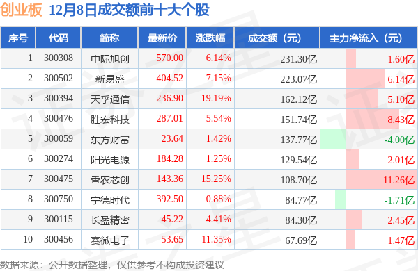 当日创业板成交额前10大个股全线收涨,平均涨幅7.26%,其中中际旭创(300308)以成交额231.3亿元排第一。从主力资金流入看,成交额前10大个股中有8只个股呈现主力资金净流入。