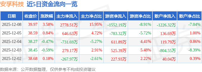 证券之星消息,截至2025年12月8日收盘,安孚科技(603031)报收于39.97元,上涨3.58%,换手率2.08%,成交量4.4万手,成交额1.74亿元。