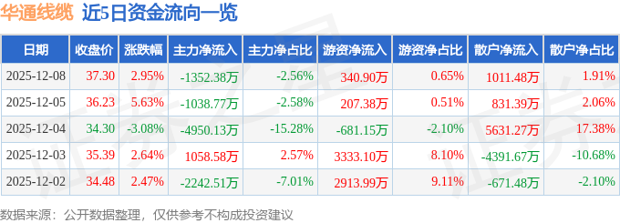 证券之星消息,截至2025年12月8日收盘,华通线缆(605196)报收于37.3元,上涨2.95%,换手率2.92%,成交量14.73万手,成交额5.28亿元。