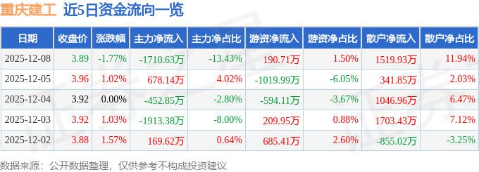 证券之星消息,截至2025年12月8日收盘,重庆建工(600939)报收于3.89元,下跌1.77%,换手率1.72%,成交量32.68万手,成交额1.27亿元。