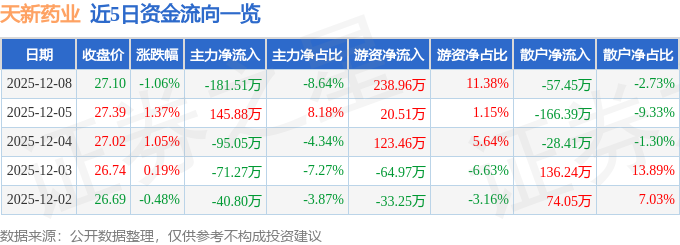 证券之星消息,截至2025年12月8日收盘,天新药业(603235)报收于27.1元,下跌1.06%,换手率0.53%,成交量7764.0手,成交额2100.53万元。