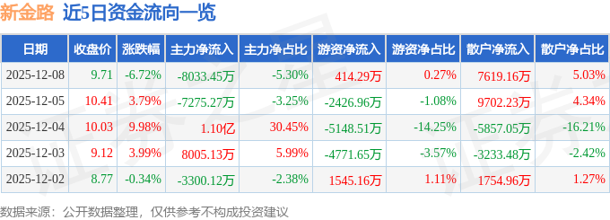 证券之星消息,截至2025年12月8日收盘,新金路(000510)报收于9.71元,下跌6.72%,换手率25.24%,成交量153.13万手,成交额15.15亿元。