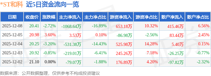 证券之星消息,截至2025年12月8日收盘,*ST和科(002816)报收于20.41元,下跌2.72%,换手率3.1%,成交量3.1万手,成交额6328.53万元。