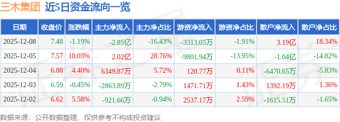 证券之星消息,截至2025年12月8日收盘,三木集团(000632)报收于7.48元,下跌1.19%,换手率48.29%,成交量224.79万手,成交额17.37亿元。