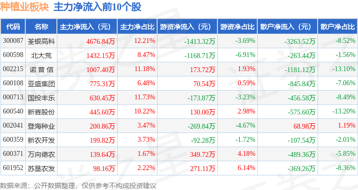 从资金流向上来看,当日种植业板块主力资金净流出553.12万元,游资资金净流入1789.13万元,散户资金净流出1236.0万元。种植业板块个股资金流向见下表:
