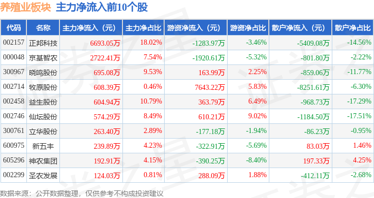 从资金流向上来看,当日养殖业板块主力资金净流出1.06亿元,游资资金净流入1.51亿元,散户资金净流出4486.33万元。养殖业板块个股资金流向见下表: