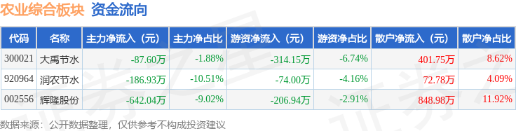 从资金流向上来看,当日农业综合板块主力资金净流出729.64万元,游资资金净流出521.09万元,散户资金净流入1250.73万元。农业综合板块个股资金流向见下表:
