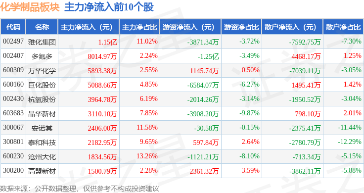 从资金流向上来看,当日化学制品板块主力资金净流出2.04亿元,游资资金净流入555.85万元,散户资金净流入1.99亿元。化学制品板块个股资金流向见下表:
