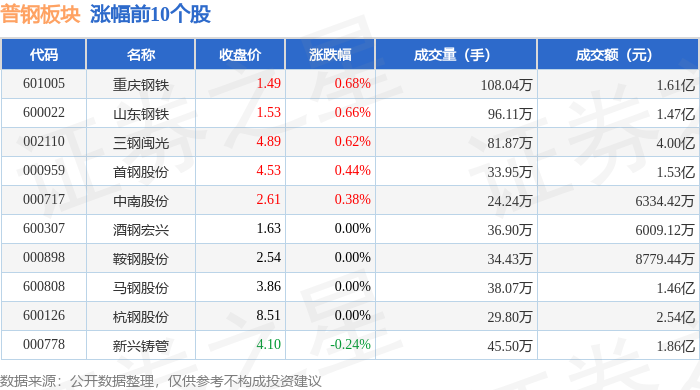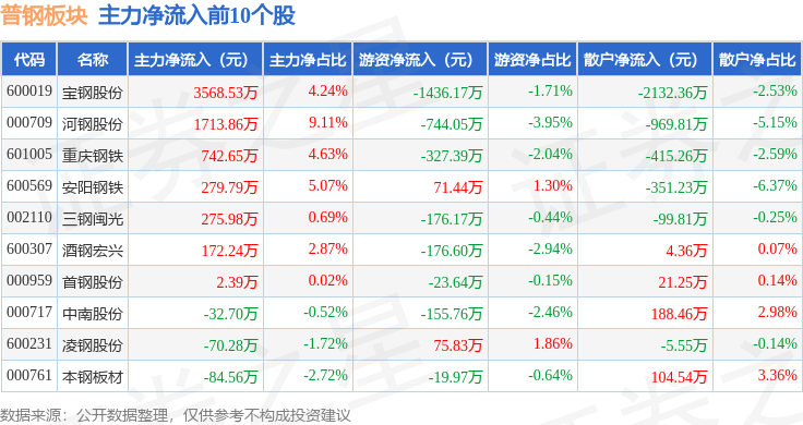 从资金流向上来看,当日普钢板块主力资金净流出1.06亿元,游资资金净流入2367.3万元,散户资金净流入8185.13万元。普钢板块个股资金流向见下表: