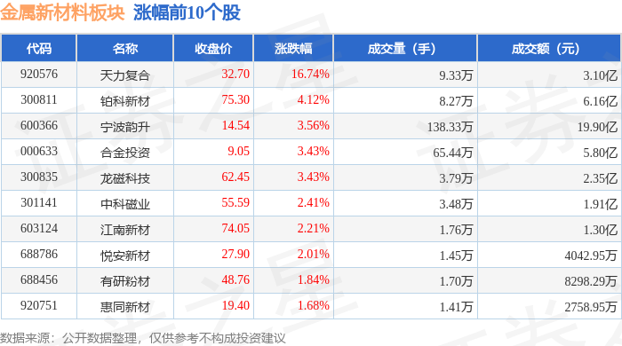 从资金流向上来看,当日金属新材料板块主力资金净流出4.23亿元,游资资金净流入2.12亿元,散户资金净流入2.11亿元。金属新材料板块个股资金流向见下表: