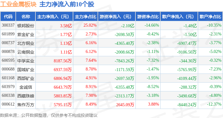 从资金流向上来看,当日工业金属板块主力资金净流入7.64亿元,游资资金净流出6792.56万元,散户资金净流出6.96亿元。工业金属板块个股资金流向见下表: