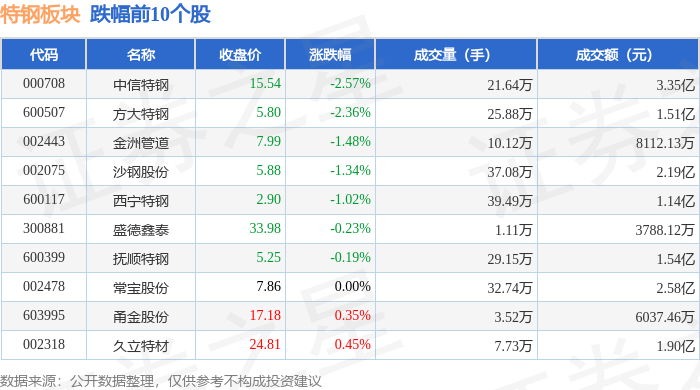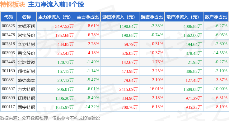 从资金流向上来看,当日特钢板块主力资金净流出237.86万元,游资资金净流入6071.85万元,散户资金净流出5833.98万元。特钢板块个股资金流向见下表: