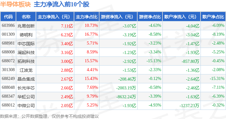 从资金流向上来看,当日半导体板块主力资金净流入44.29亿元,游资资金净流出21.82亿元,散户资金净流出22.47亿元。半导体板块个股资金流向见下表: