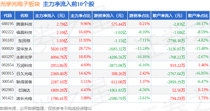 从资金流向上来看,当日光学光电子板块主力资金净流出14.87亿元,游资资金净流入3018.43万元,散户资金净流入14.57亿元。光学光电子板块个股资金流向见下表: