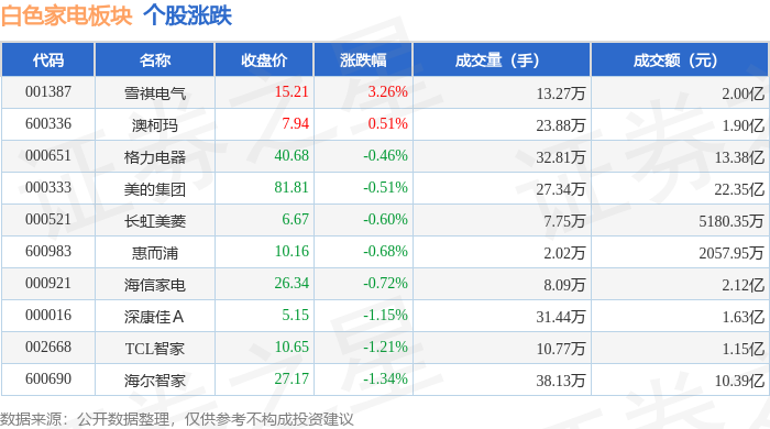 证券之星消息,12月8日白色家电板块较上一交易日下跌0.65%,海尔智家领跌。当日上证指数报收于3924.08,上涨0.54%。深证成指报收于13329.99,上涨1.39%。白色家电板块个股涨跌见下表: