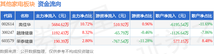 从资金流向上来看,当日其他家电板块主力资金净流入7067.44万元,游资资金净流出322.41万元,散户资金净流出6745.03万元。其他家电板块个股资金流向见下表: