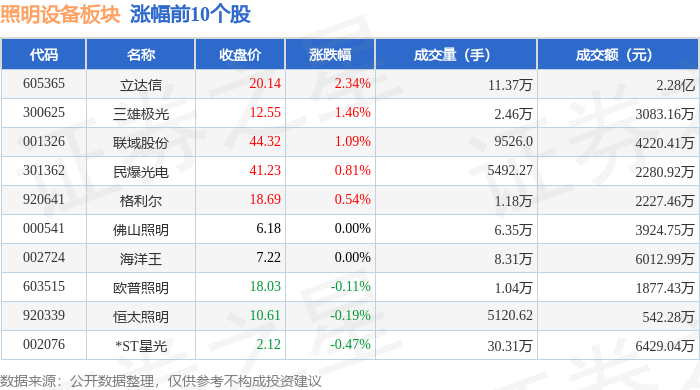 证券之星消息,12月8日照明设备板块较上一交易日上涨0.03%,立达信领涨。当日上证指数报收于3924.08,上涨0.54%。深证成指报收于13329.99,上涨1.39%。照明设备板块个股涨跌见下表: