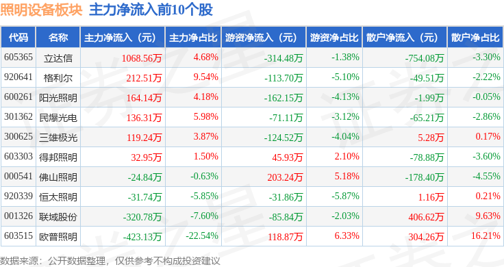 从资金流向上来看,当日照明设备板块主力资金净流出4748.3万元,游资资金净流入253.05万元,散户资金净流入4495.24万元。照明设备板块个股资金流向见下表: