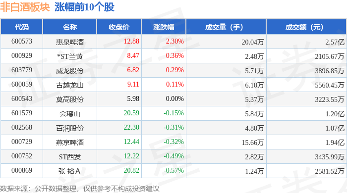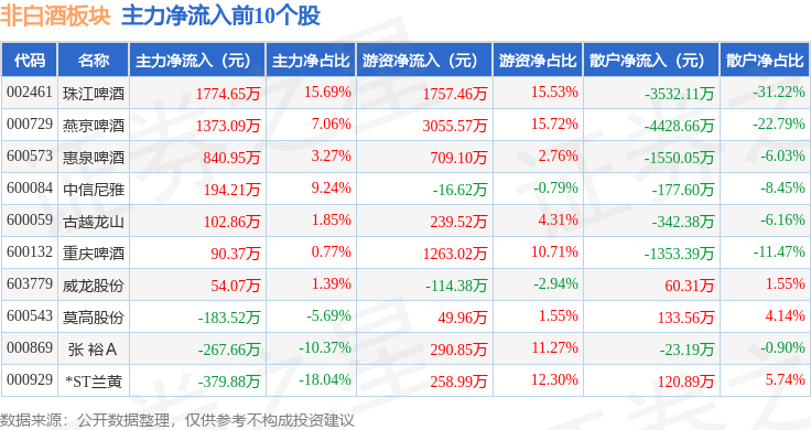 从资金流向上来看,当日非白酒板块主力资金净流出8412.86万元,游资资金净流入1.36亿元,散户资金净流出5229.98万元。非白酒板块个股资金流向见下表: