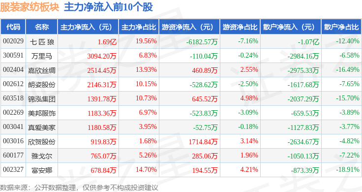 从资金流向上来看,当日服装家纺板块主力资金净流入3436.44万元,游资资金净流入1593.1万元,散户资金净流出5029.54万元。服装家纺板块个股资金流向见下表: