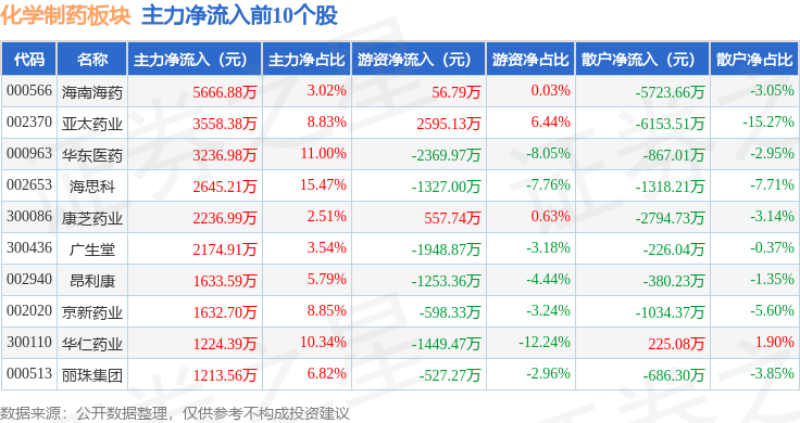 从资金流向上来看,当日化学制药板块主力资金净流出7.28亿元,游资资金净流入1.27亿元,散户资金净流入6.02亿元。化学制药板块个股资金流向见下表: