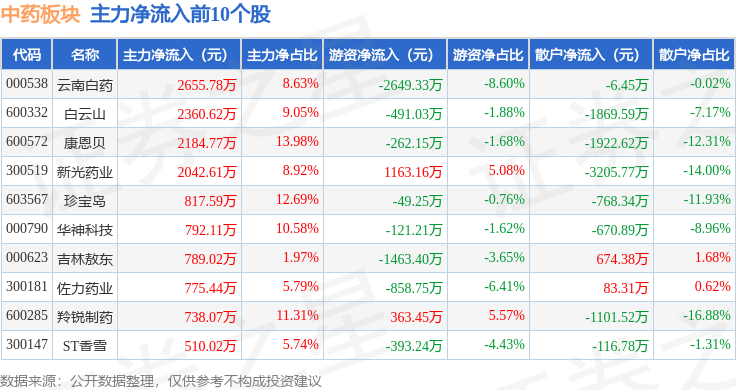 从资金流向上来看,当日中药板块主力资金净流出7.23亿元,游资资金净流入2.54亿元,散户资金净流入4.69亿元。中药板块个股资金流向见下表: