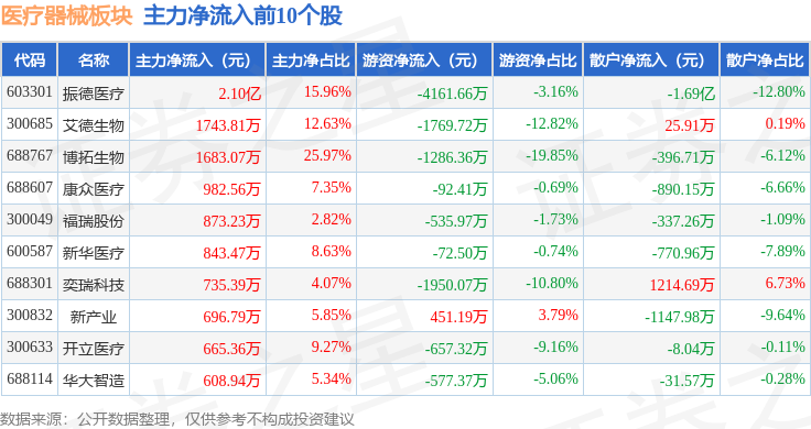 从资金流向上来看,当日医疗器械板块主力资金净流出1.99亿元,游资资金净流出1351.3万元,散户资金净流入2.13亿元。医疗器械板块个股资金流向见下表: