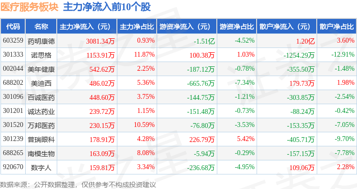 从资金流向上来看,当日医疗服务板块主力资金净流出2.97亿元,游资资金净流出1990.77万元,散户资金净流入3.17亿元。医疗服务板块个股资金流向见下表: