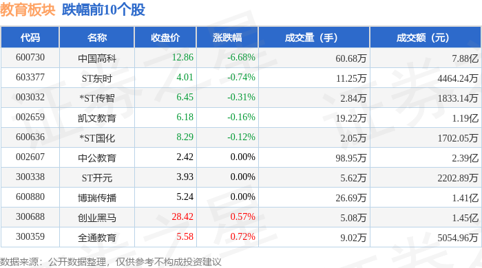 证券之星消息,12月8日教育板块较上一交易日上涨0.69%,科德教育领涨。当日上证指数报收于3924.08,上涨0.54%。深证成指报收于13329.99,上涨1.39%。教育板块个股涨跌见下表: