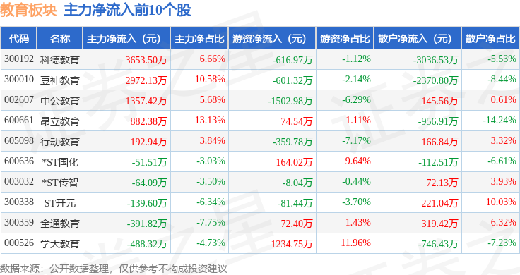 从资金流向上来看,当日教育板块主力资金净流出8188.8万元,游资资金净流入1326.82万元,散户资金净流入6861.98万元。教育板块个股资金流向见下表: