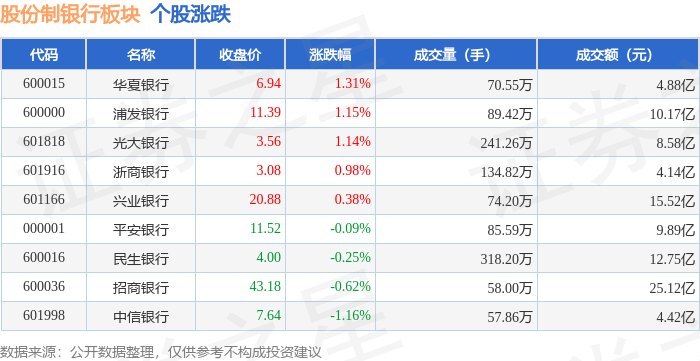 证券之星消息,12月8日股份制银行板块较上一交易日上涨0.0%,华夏银行领涨。当日上证指数报收于3924.08,上涨0.54%。深证成指报收于13329.99,上涨1.39%。股份制银行板块个股涨跌见下表: