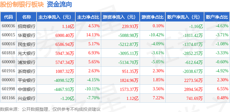 从资金流向上来看,当日股份制银行板块主力资金净流入1.71亿元,游资资金净流出2731.29万元,散户资金净流出1.44亿元。股份制银行板块个股资金流向见下表: