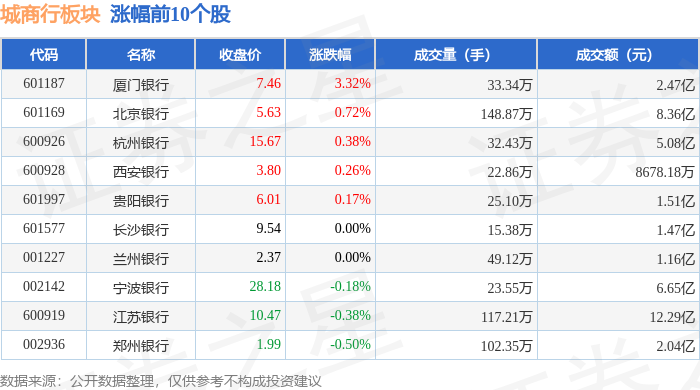 证券之星消息,12月8日城商行板块较上一交易日下跌0.31%,上海银行领跌。当日上证指数报收于3924.08,上涨0.54%。深证成指报收于13329.99,上涨1.39%。城商行板块个股涨跌见下表: