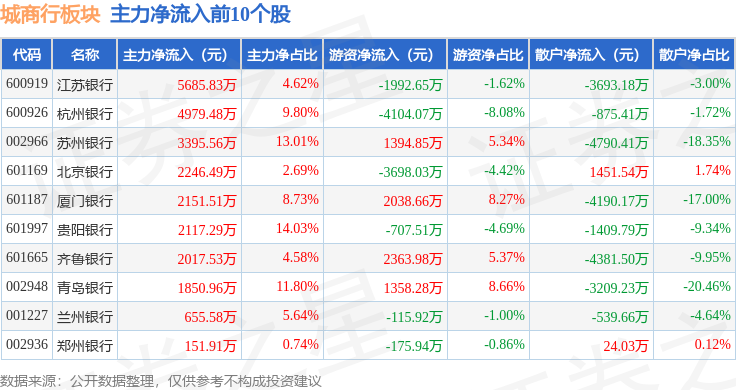 从资金流向上来看,当日城商行板块主力资金净流入1.29亿元,游资资金净流入2676.7万元,散户资金净流出1.56亿元。城商行板块个股资金流向见下表: