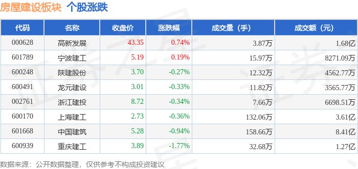 证券之星消息,12月8日房屋建设板块较上一交易日下跌0.78%,重庆建工领跌。当日上证指数报收于3924.08,上涨0.54%。深证成指报收于13329.99,上涨1.39%。房屋建设板块个股涨跌见下表: