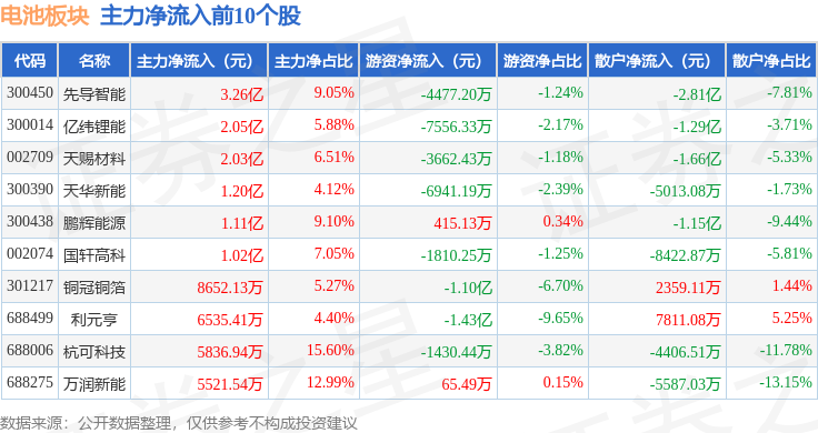 从资金流向上来看,当日电池板块主力资金净流入12.78亿元,游资资金净流出2.78亿元,散户资金净流出10.0亿元。电池板块个股资金流向见下表: