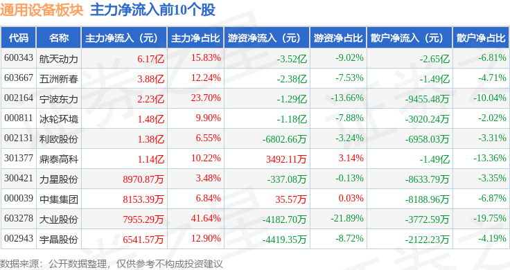 从资金流向上来看,当日通用设备板块主力资金净流入5.29亿元,游资资金净流出13.61亿元,散户资金净流入8.31亿元。通用设备板块个股资金流向见下表: