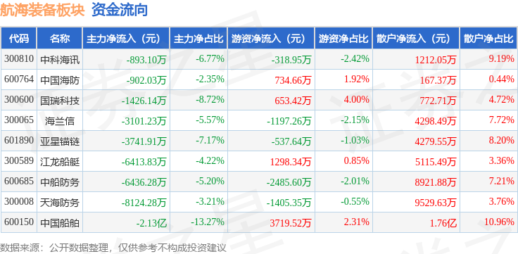 从资金流向上来看,当日航海装备板块主力资金净流出5.24亿元,游资资金净流入461.14万元,散户资金净流入5.19亿元。航海装备板块个股资金流向见下表: